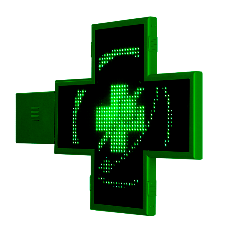 Cruz de farmacia monocolor en verde con 2.560 LEDs de tipo radial de 5 mm que alumbran un total de 53.760 candelas. El ciclo de vida de estos LEDs es de 100.000 horas.