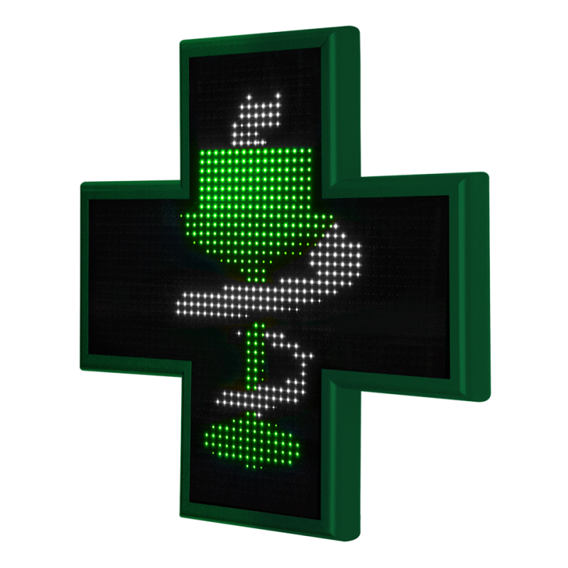 Cruz de farmacia bicolor con 5.120 LEDs de tipo radial de 5 mm que alumbran un total de 107.520 candelas. El ciclo de vida de estos LEDs es de 100.000 horas.