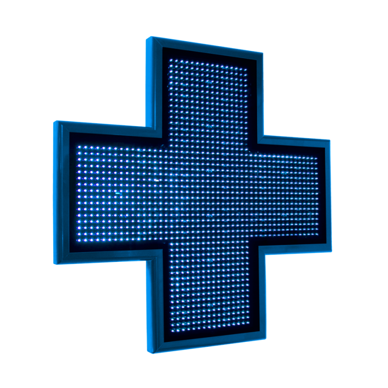 Cruz de veterinaria con led monocolor azul con 2.560 LEDs radiales de 5 mm que alumbran un total de 26.880 candelas. El ciclo de vida de estos LEDs es de 100.000 horas.