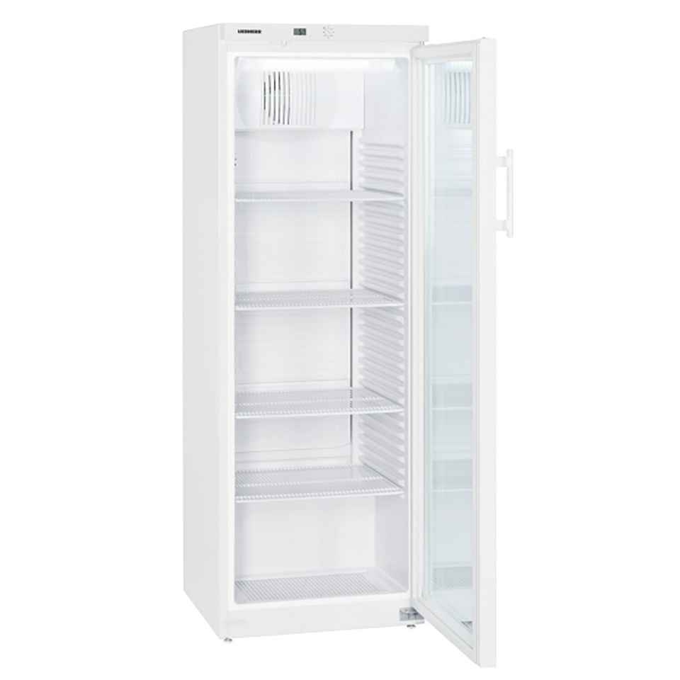 Este frigorífico de color blanco cuenta con un consumo eficiente, puerta de cristal y cerradura.